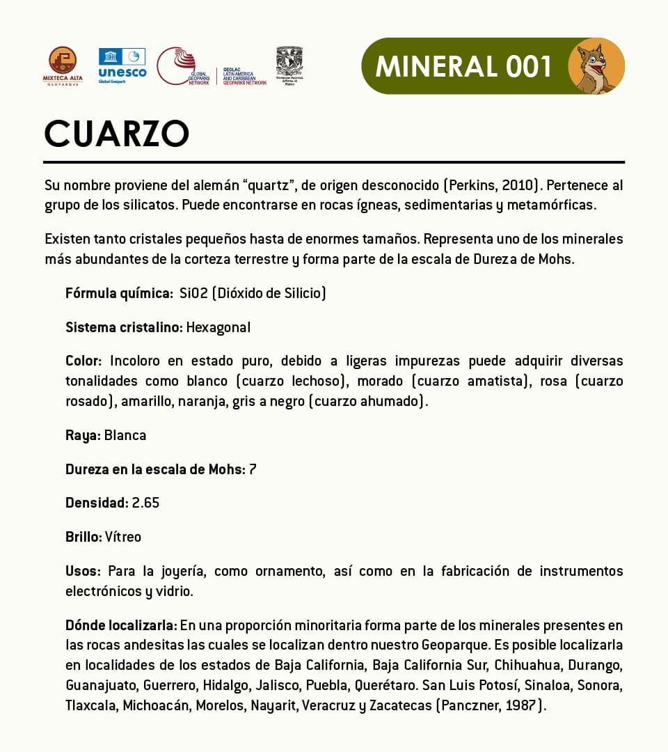 Su nombre proviene de la palabra alemán quartz, de origen desconocido (Perkins, 2010). Pertenece al grupo de los silicatos. Puede encontrarse en rocas ígneas, sedimentarias y metamórficas. Es un mineral que varía desde cristales pequeños hasta cristales de enormes tamaños. Representa uno de los minerales más abundantes de la corteza terrestre y forma parte de la escala de Dureza de Mohs.