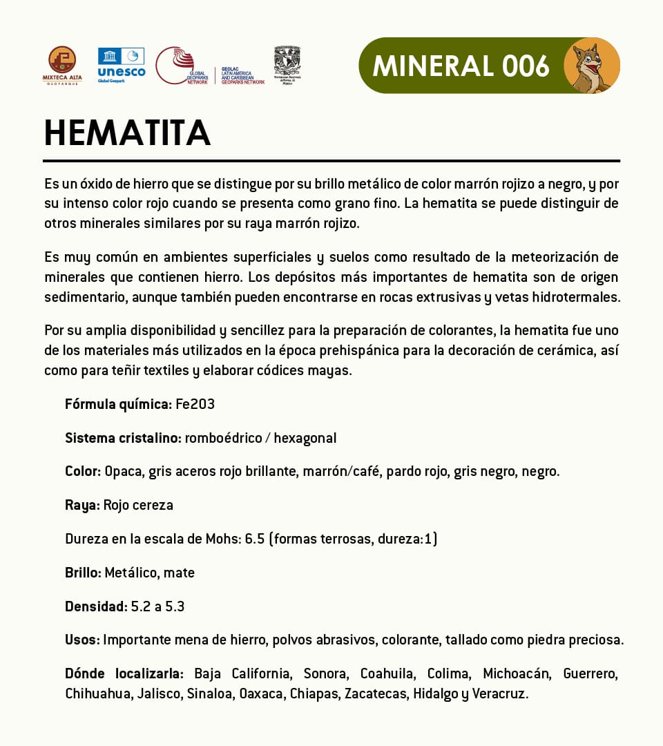 Por su amplia disponibilidad y sencillez para la preparación de colorantes, la hematita fue uno de los materiales más utilizados en la época prehispánica para la decoración de cerámica, así como para teñir textiles y elaborar códices mayas.