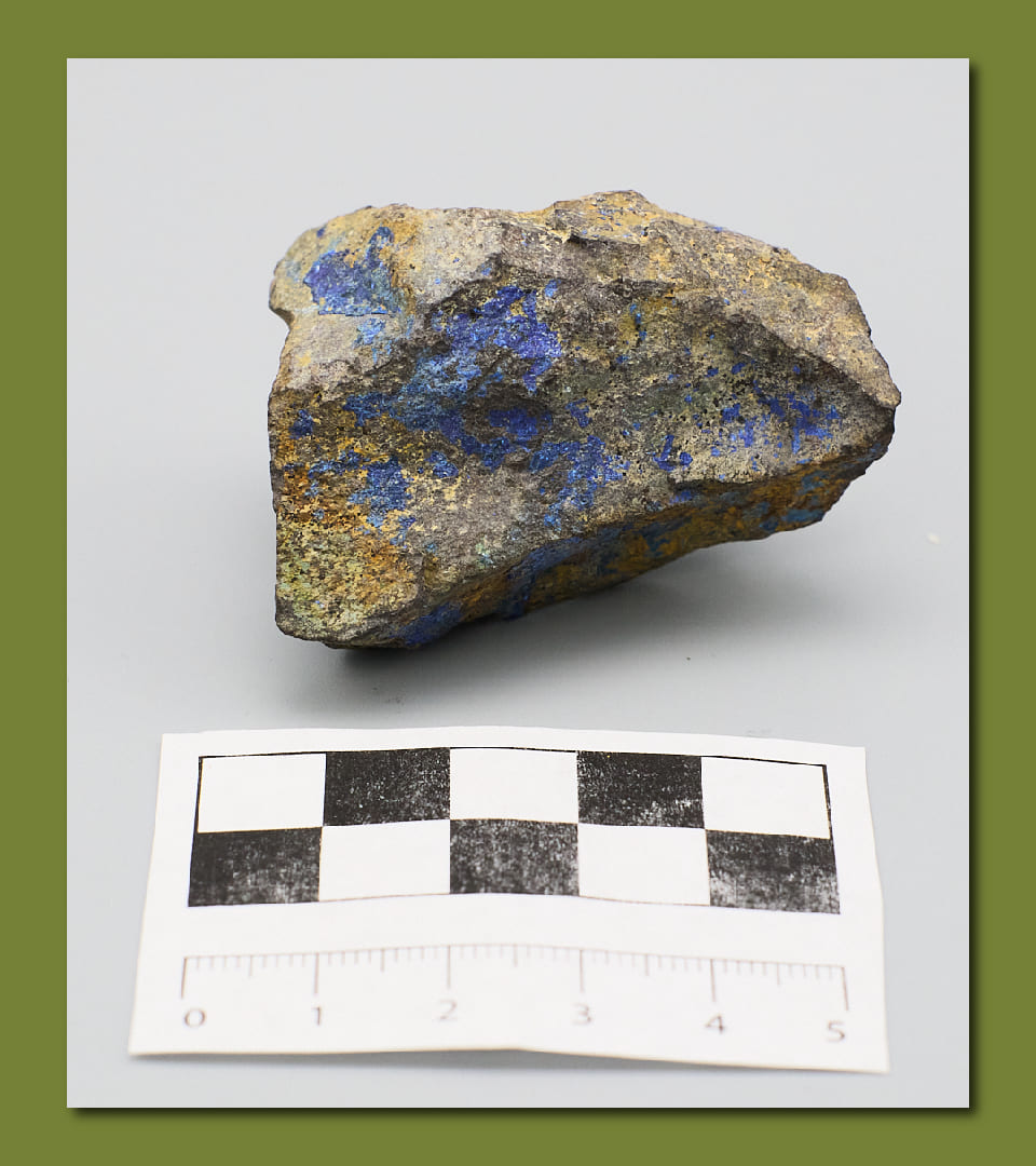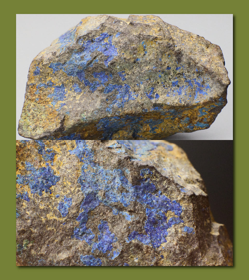 La azurita es un mineral secundario que se forma en las zonas oxidadas expuestas a la superficie de los depósitos de mineral de cobre mediante la reacción de iones de cobre con iones de carbonato y agua.