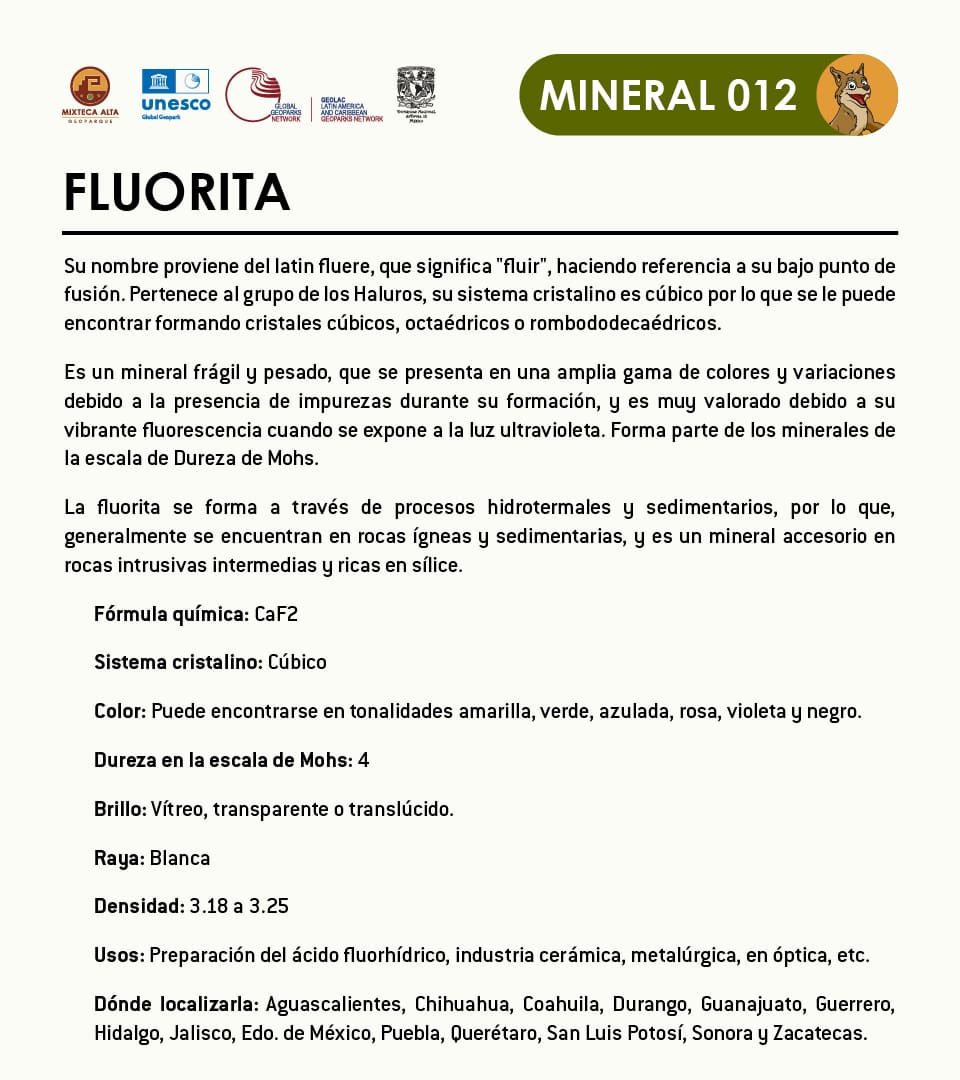 Su nombre proviene del latin fluere, que significa “fluir“, haciendo referencia a su bajo punto de fusión. Pertenece al grupo de los Haluros, su sistema cristalino es cúbico por lo que se le puede encontrar formando cristales cúbicos, octaédricos o rombododecaédricos. Es un mineral frágil y pesado, que se presenta en una amplia gama de colores y variaciones debido a la presencia de impurezas durante su formación, y es muy valorado debido a su vibrante fluorescencia cuando se expone a la luz ultravioleta. Forma parte de los minerales de la escala de Dureza de Mohs.