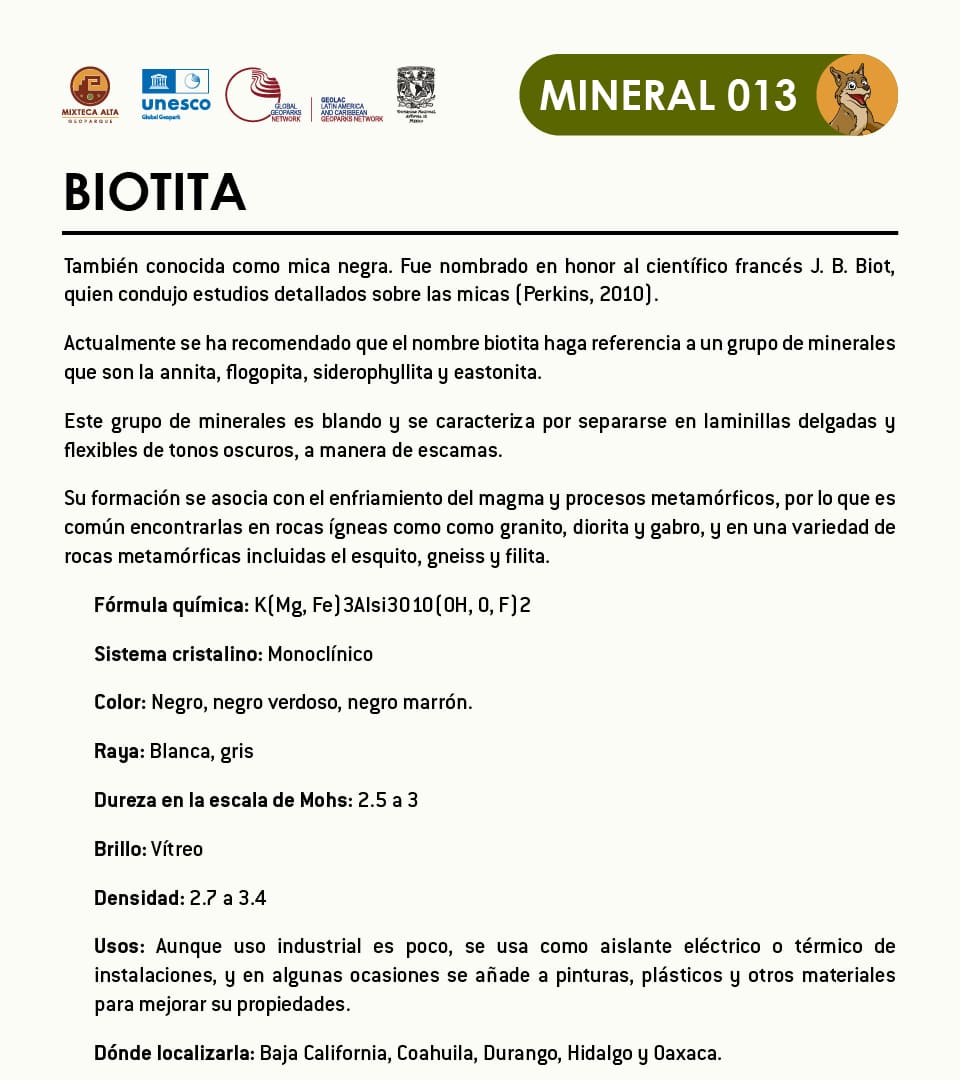 También conocida como mica negra. Fue nombrado en honor al científico francés J. B. Biot, quien condujo estudios detallados sobre las micas (Perkins, 2010).